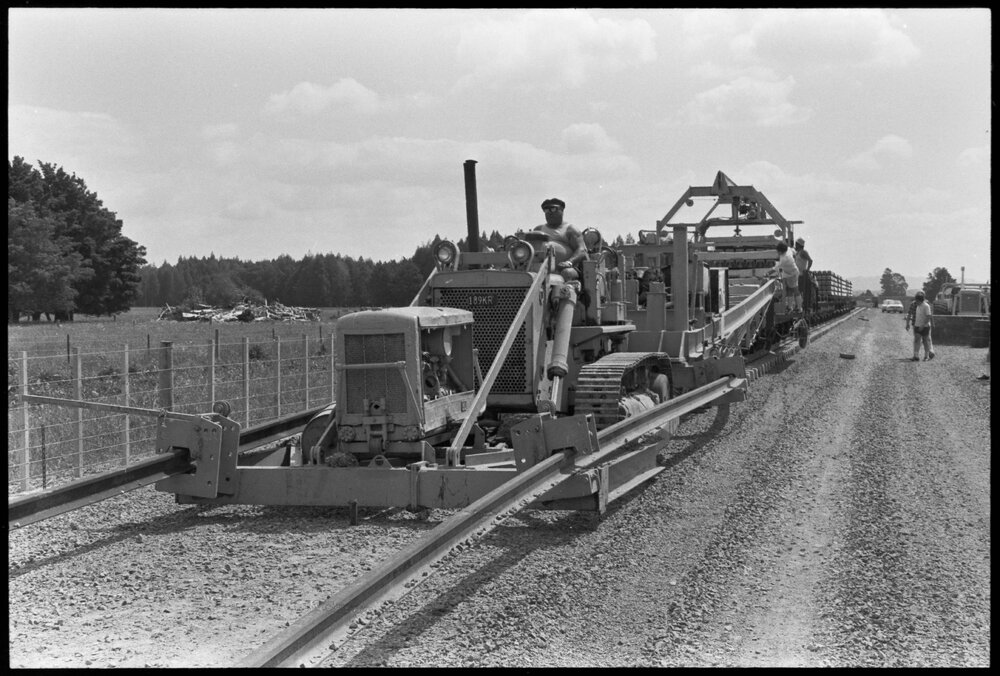 Date5 December 1973Reference NumberPhoto gcc-30745DescriptionThe mobile track layer in action near Waharoa, the only machine of its kind in New Zealand is steadily crawling toward the Kaimai tunnel-spurting out concrete railway sleepers and tucking lengths of railway line into place. Published 5 December 1973.FormatNegativePhysical Description35mm black-and-white negative (1/3)Photographer/CreatorBay of Plenty Times