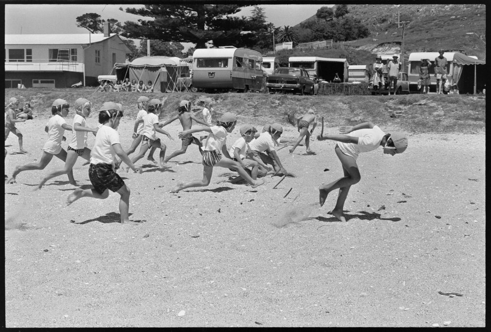 Date7 December 1973Reference NumberPhoto gcc-30775DescriptionMount Nippers Club members engage in beach activities, Mount Maunganui beach. Published December 1973.FormatNegativePhysical Description35mm black-and-white negative (1/3)Photographer/CreatorBay of Plenty Times