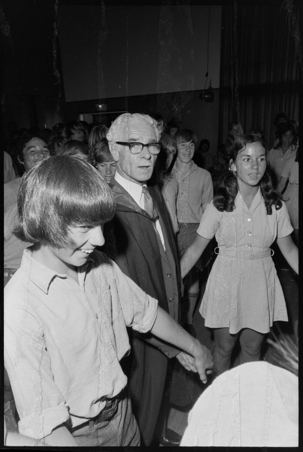 Date8 December 1973Reference NumberPhoto gcc-30786DescriptionHigh school principal, Mr A. L. Litt, joins with pupils in singing "Auld Lang Syne" at the end of the school's junior prizegiving ceremony at Te Puke High School prizegiving. Published December 1973.FormatNegativePhysical Description35mm black-and-white negative (3/3)Photographer/CreatorBay of Plenty Times