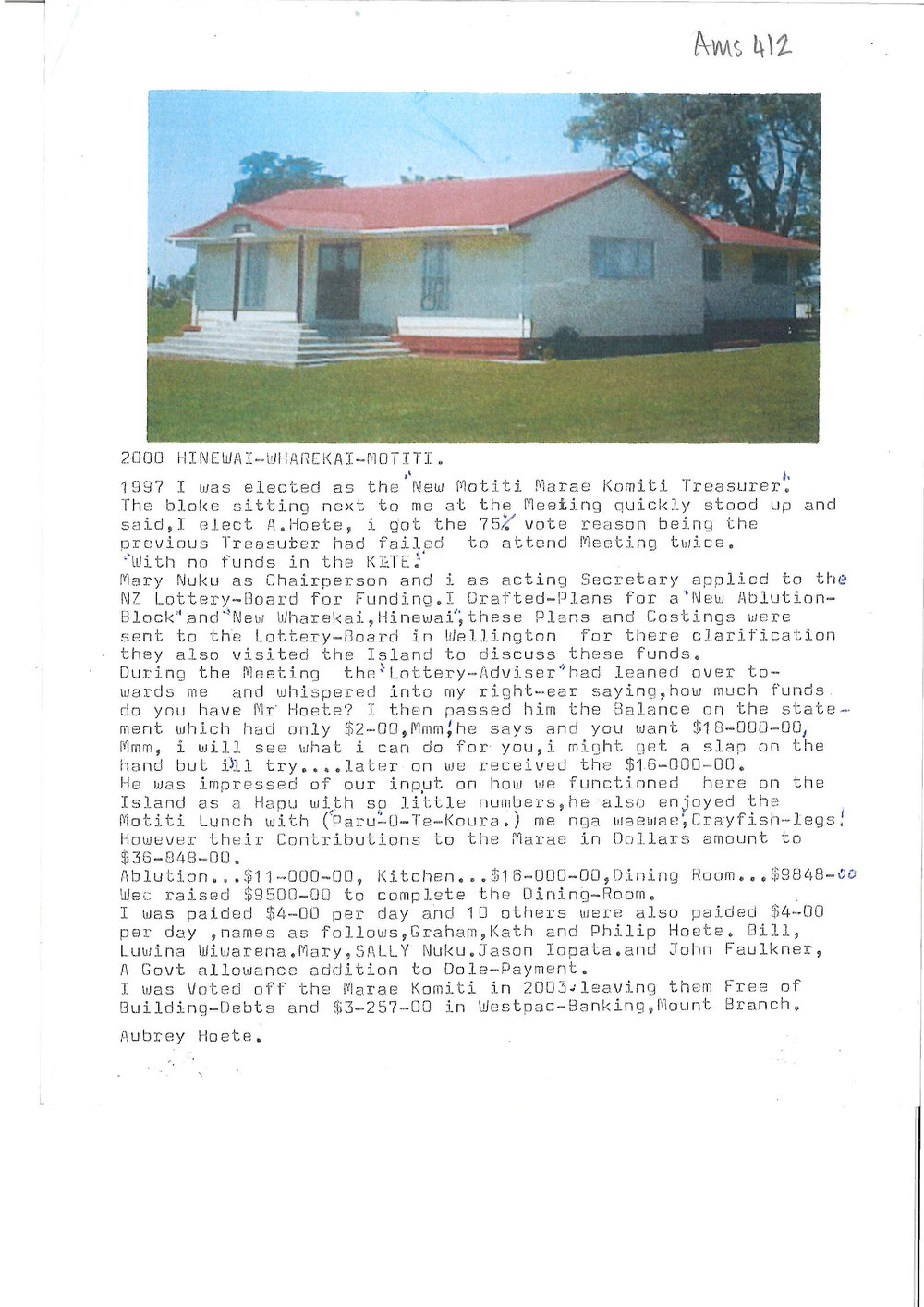 Date2000Reference NumberAms 412/1DescriptionSingle-page typed document wherein Aubrey Hoete recounts his time as Treasurer of the New Mōtītī Marae Komiti from 1997, where he successfully secured $16,000 in funding from the NZ Lottery Board to improve the Marae's ablution block, kitchen, and dining room. By 2003, the Marae was debt-free with a small bank balance, and Aubrey stepped down from his role.CreatorHoete, AubreyLevelItemFormatTypescriptExtent1 pagePhysical DescriptionPage size is 297mm by 210mm by 1mm LanguageEnglishTe Reo Māori