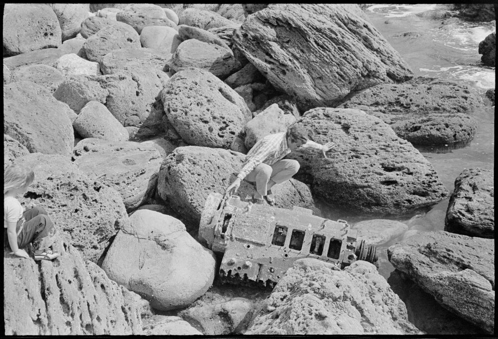 Date17 September 1975Reference Numberphoto gcc-35064DescriptionBay of Plenty Times reporter Phil Smith examines a piece of the wreckage of the Rānui. Published 17 September 1975FormatNegativePhysical Description35mm black-and-white negative (8/9)Photographer/CreatorBay of Plenty Times
