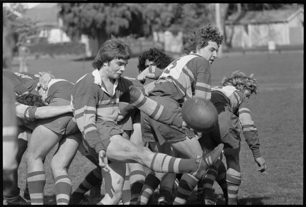 Date18 September 1975Reference Numberphoto gcc-35078DescriptionK. Garrity kicks Shalfoon Shield Tauranga under 21 vs Rangatiki at Tauranga Domain. Published 18 September 1975FormatNegativePhysical Description35mm black-and-white negative (4/10)Photographer/CreatorBay of Plenty Times