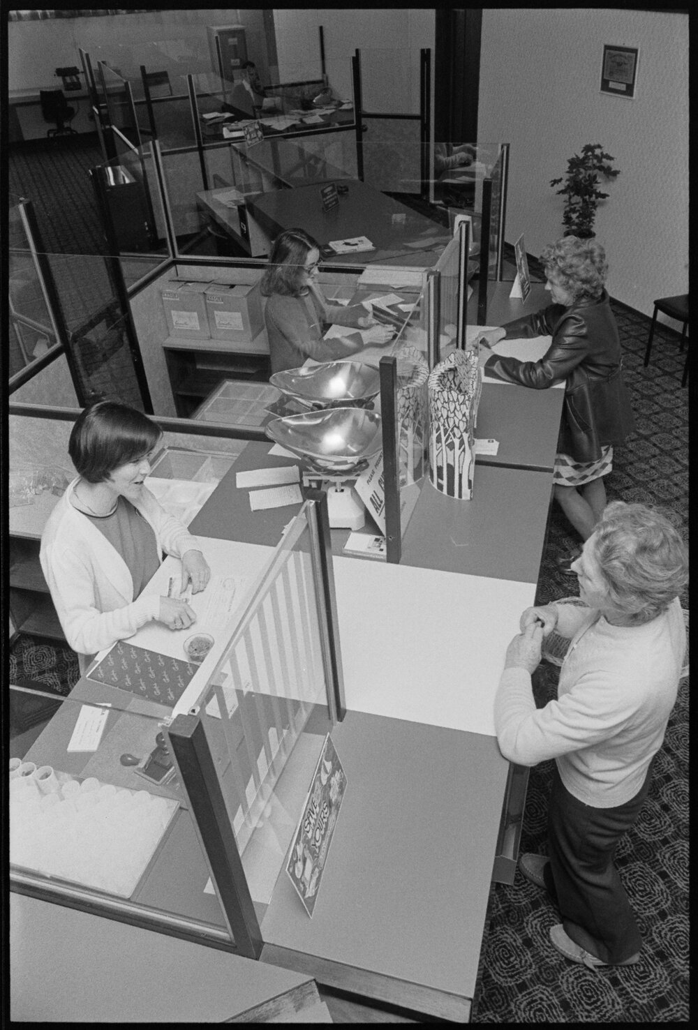 Date19 September 1975Reference Numberphoto gcc-35102DescriptionServing the first customers at the new branch of the Commercial Bank of Australia, at 11th Avenue, are K. R. Armstrong (in foreground) and R. M. Alp. Published 19 September 1975FormatNegativePhysical Description35mm black-and-white negative (1/3)Photographer/CreatorBay of Plenty Times