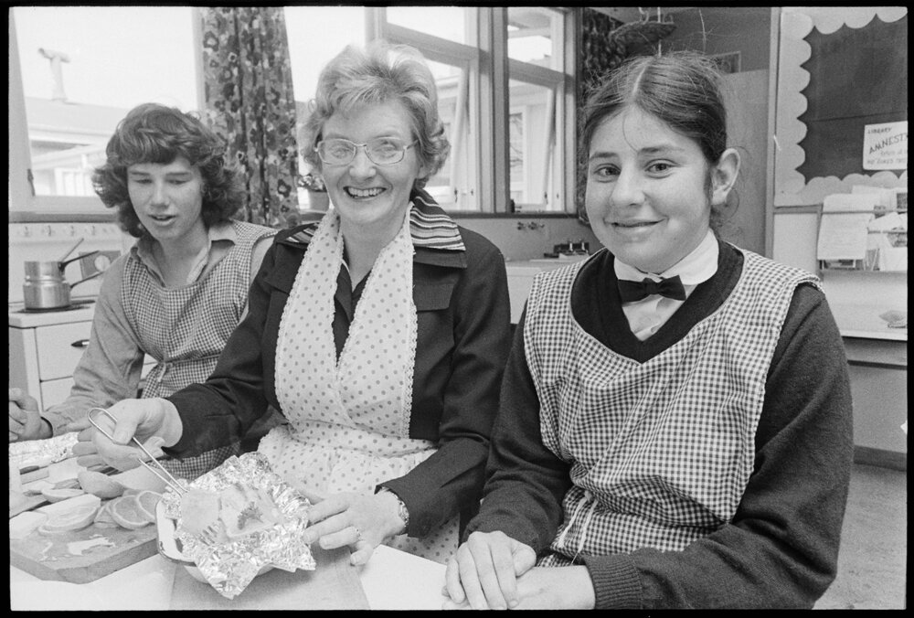 Date20 September 1975Reference Numberphoto gcc-35141DescriptionMrs Jean Phipps, consultant from the Fishing Industry board demonstrates a meal made with fish at Ōtūmoetai College. Student Jocelyn Hansen is pictured on her right testing the dish. Published 20 September 1975FormatNegativePhysical Description35mm black-and-white negative (6/6)Photographer/CreatorBay of Plenty Times