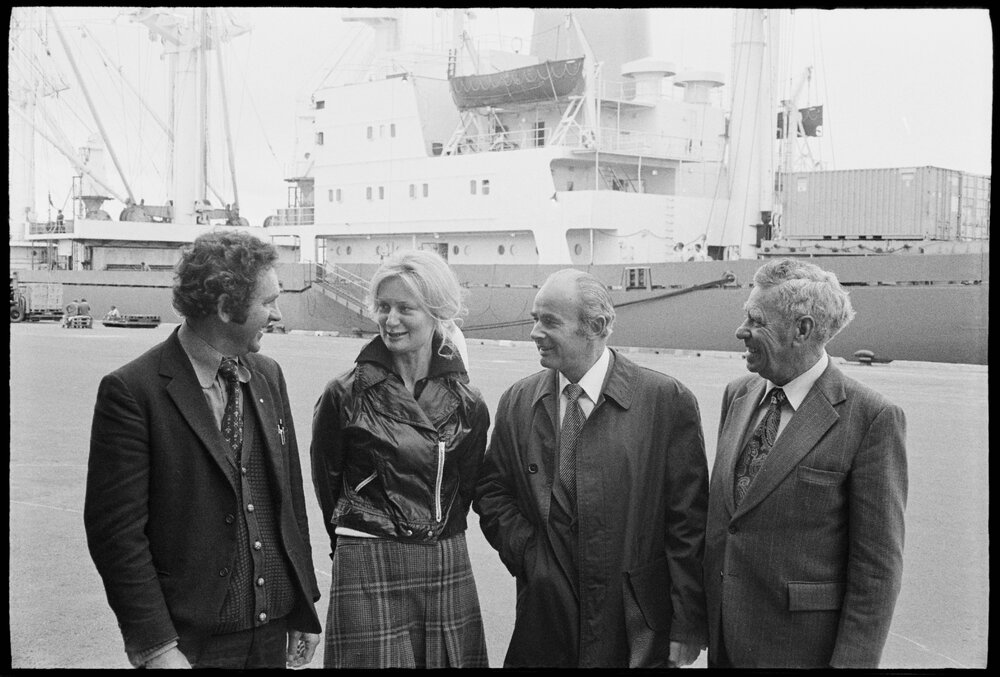 Date20 September 1975Reference Numberphoto gcc-35150DescriptionTwo Polish dairy inspectors visit Mount Maunganui. From left are Mr Ian Jamieson, the Dairy Board inspector in Mount Maunganui, Mrs Jagwida Urbanska, Mr Franciszek Dorczak and Mr Jack Valder, plant superintendent. In the background is the freighter Mayfield on which the first part of the 4500 tonne order butter is being loaded. Published 20 September 1976FormatNegativePhysical Description35mm black-and-white negative (3/3)Photographer/CreatorBay of Plenty Times