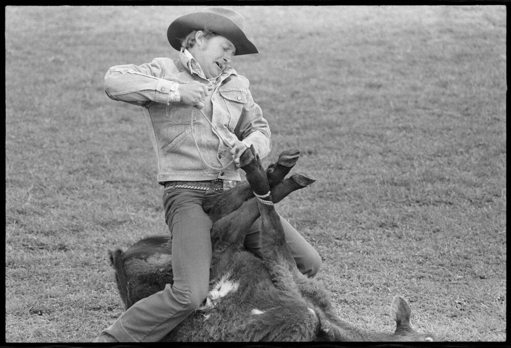 Date22 September 1975Reference Numberphoto gcc-35154DescriptionSaturday's rodeo at Maketū. Auckland's Trevor Bowler successfully casts his lasso over an elusive calf in the roping competition. He then has thrown the animal and is about to start tying its legs together. He then tightens the final knot and prepares to stand up - elapsed time 58 seconds. Published 22 September 1975.FormatNegativePhysical Description35mm black-and-white negative (1/2)Photographer/CreatorBay of Plenty Times