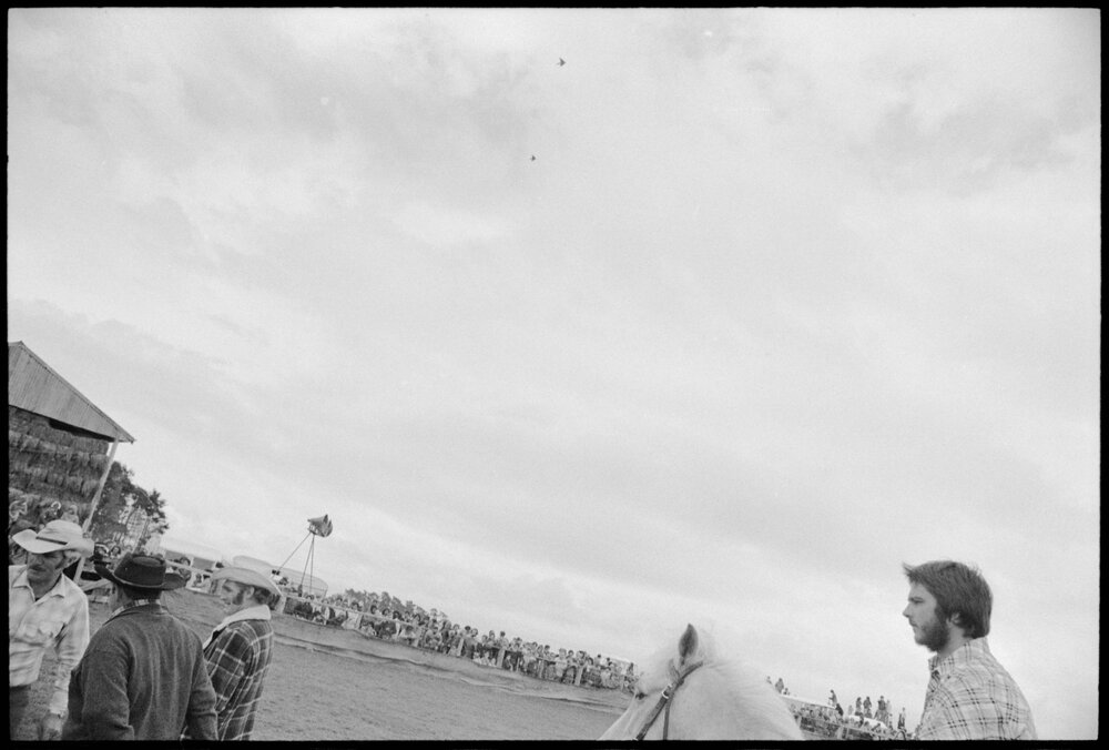 Date22 September 1975Reference Numberphoto gcc-35173DescriptionSaturday rodeo at Maketū. Slightly obscured photo. Not published 22 September 1975.FormatNegativePhysical Description35mm black-and-white negative (14/18)Photographer/CreatorBay of Plenty Times