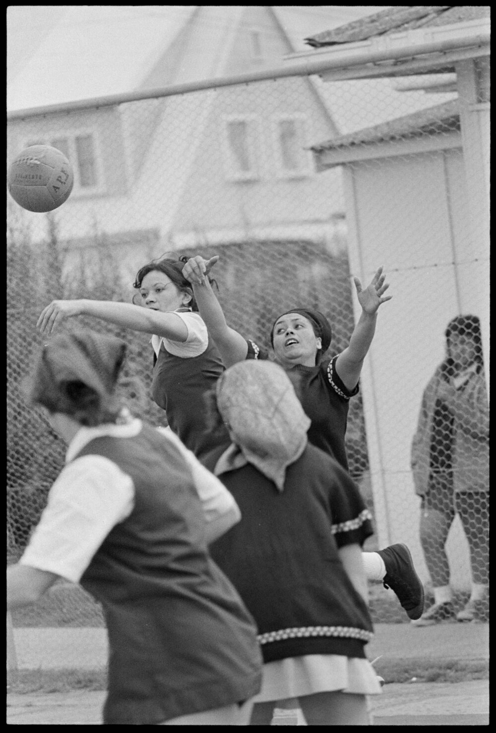 Date22 September 1975Reference Numberphoto gcc-35179DescriptionTerangi Little (left) of Tauranga and Linda Watson (Rangiora) jumping for the ball in the New Zealand Post Office netball tournament. Published 22 September 1975FormatNegativePhysical Description35mm black-and-white negative (2/3)Photographer/CreatorBay of Plenty Times