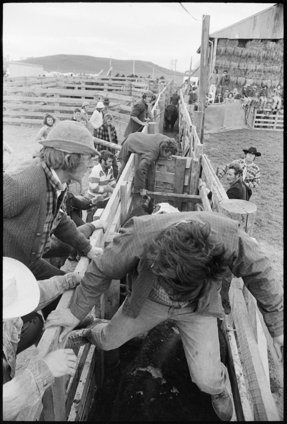 Date24 September 1975Reference Numberphoto gcc-35232DescriptionAbove the waiting steers at the Maketū Rodeo. Published 24 September 1975FormatNegativePhysical Description35mm black-and-white negative (3/3)Photographer/CreatorBay of Plenty Times