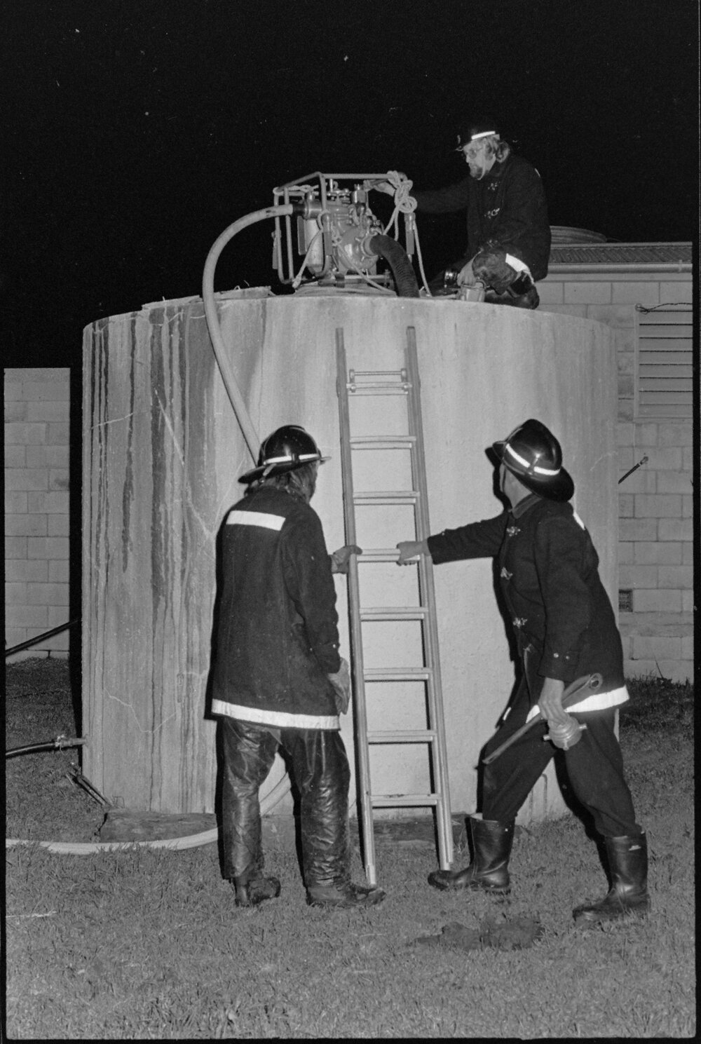 Date24 September 1975Reference Numberphoto gcc-35255DescriptionFirefighters using water from a farm tank fight a fire in a hay barn at a L. J. Warner's farm in Belk Road, Tauriko. Published 24 September 1975FormatNegativePhysical Description35mm black-and-white negative (1/4)Photographer/CreatorBay of Plenty Times