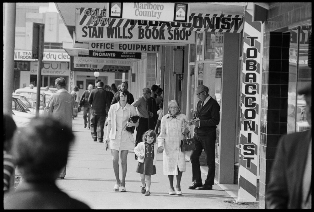Date1 October 1975Reference Numberphoto gcc-35485DescriptionShoppers along Devonport Road. Published 1 October 1975FormatNegativePhysical Description35mm black-and-white negative (2/11)Photographer/CreatorBay of Plenty Times