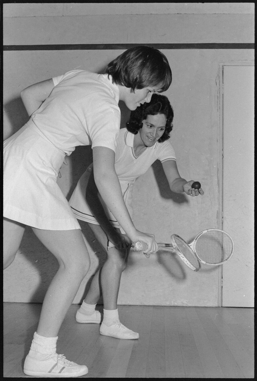 Date2 October 1975Reference Numberphoto gcc-35517DescriptionJacqui James (left) receives coaching from Maude Andrews at the Tauranga Squash Club. Published 2 October 1975.FormatNegativePhysical Description35mm black-and-white negative (5/9)Photographer/CreatorBay of Plenty Times