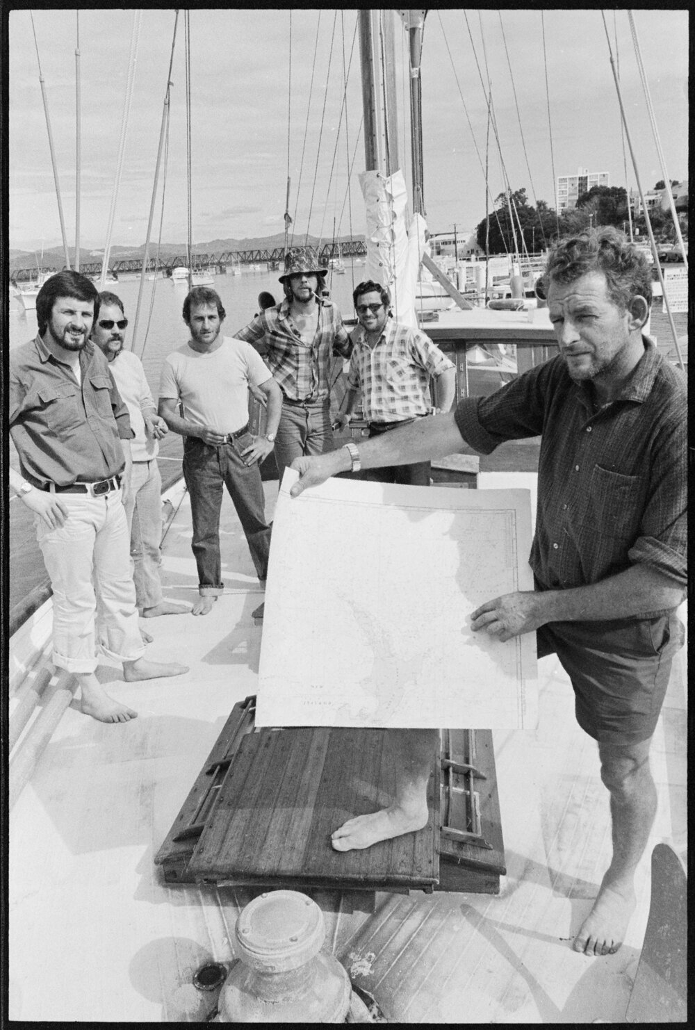 Date2 October 1975Reference Numberphoto gcc-35573DescriptionSkipper of the Nereidies, Dyson Gilliver, points to the map where they have been searching for missing ketch 'Veronica' on the east coast of the North Island. Published 2 October 1975.FormatNegativePhysical Description35mm black-and-white negative (4/7)Photographer/CreatorBay of Plenty Times