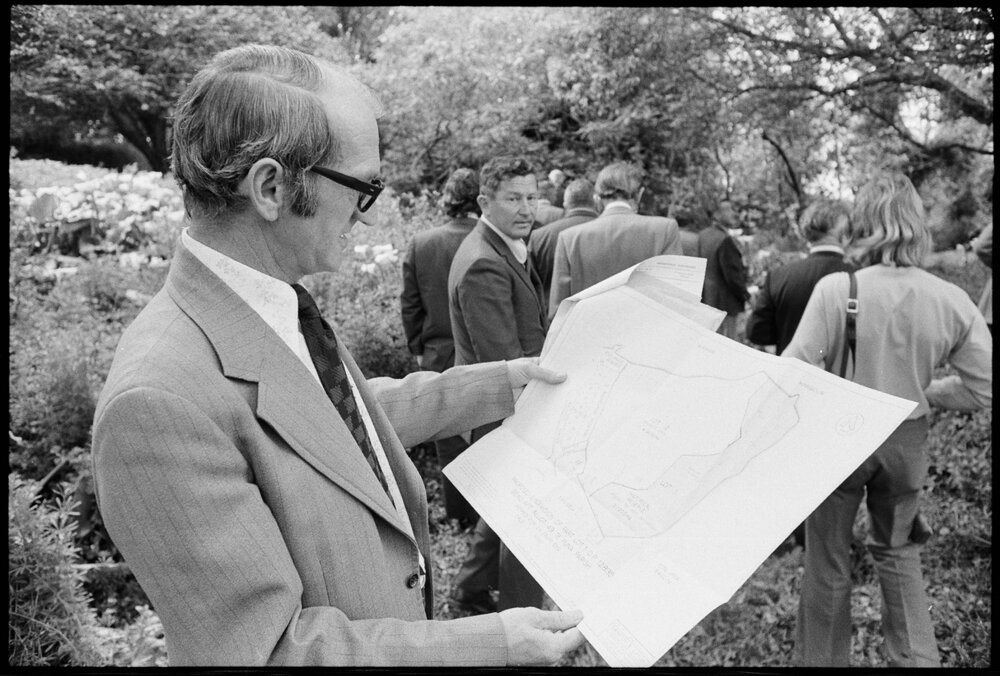 Date7 October 1975Reference Numberphoto gcc-35671DescriptionGroup walks on the five acres of land at Ōmokoroa Point to be known as the Gerald Crapp Historic Reserve, given to the public by Mr G. Crapp. Mr Turley (centre) with Mr J.P. Cooney at left, and Mrs J.V. Crapp and Mr. D.S. Cooney. Published October 1975FormatNegativePhysical Description35mm black-and-white negative (1/20)Photographer/CreatorBay of Plenty Times