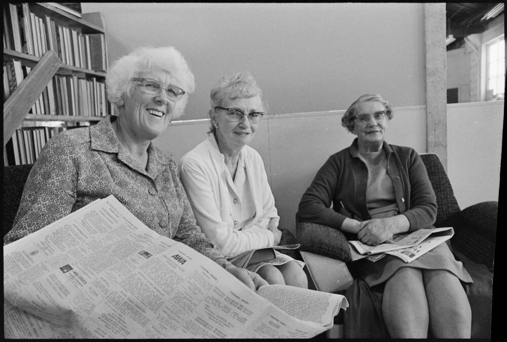 Date7 October 1975Reference Numberphoto gcc-35691DescriptionFrom left are Mrs. B. Ellinger, Mrs. E. Bateman and Mrs. G. Hawley. A lounge has been set up for them in the Salvation Army’s Red Shield shop in Hamilton street, with a television set, easy-chairs and an assortment of books and magazines. Published 7 October 1975FormatNegativePhysical Description35mm black-and-white negative (1/9)Photographer/CreatorBay of Plenty Times