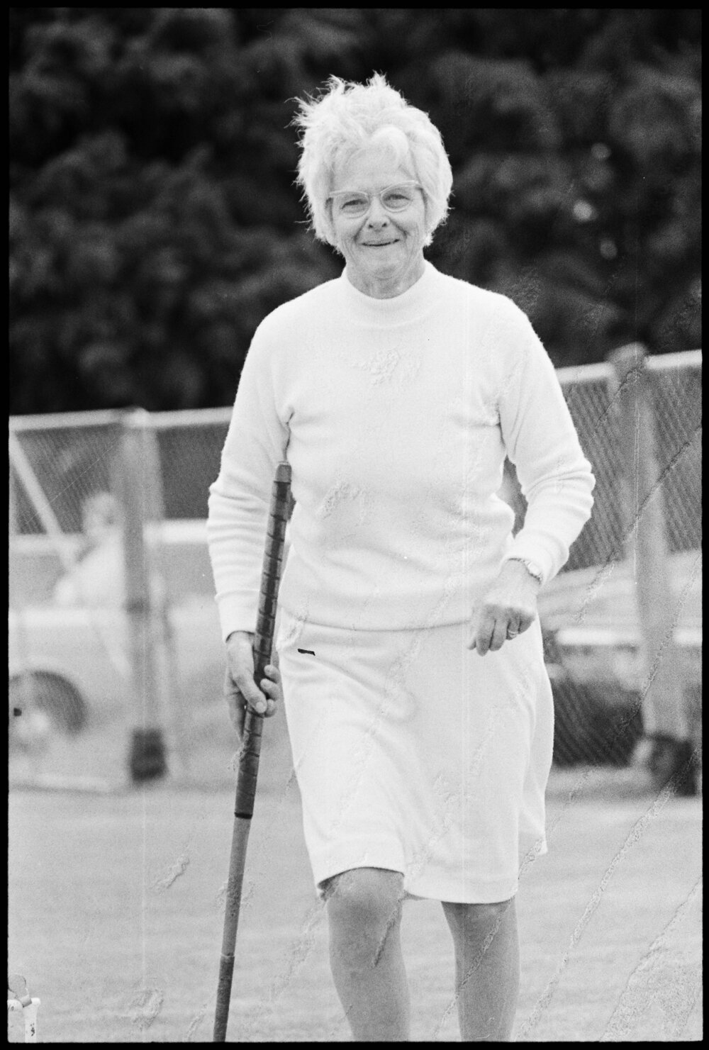 Date8 October 1975Reference Numberphoto gcc-35737DescriptionMrs A. McConnell, of Thames Valley, lining up a croquet shot under the scrutiny of the umpire, Mrs H. Nichols. Published 8 October 1975.FormatNegativePhysical Description35mm black-and-white negative (8/9)Photographer/CreatorBay of Plenty Times