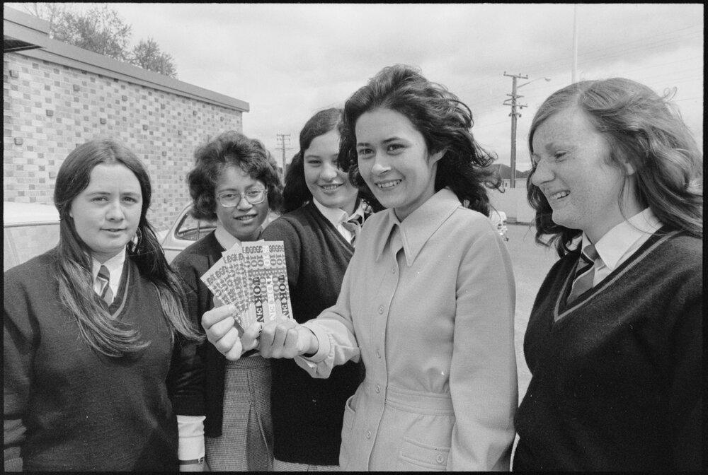 Date8 October 1975Reference Numberphoto gcc-35748DescriptionMrs M. Algie, an education officer from the Consumers' Institute with $10 book vouchers for Tauranga Girls College fourth form pupils who won the national survey and display competition. They are: (from left) Lorraine Hill, Lul Grant, Mary-Anne August, Mrs Algie and Coralie Carter. Published 8 October 1975.FormatNegativePhysical Description35mm black-and-white negative (1/3)Photographer/CreatorBay of Plenty Times