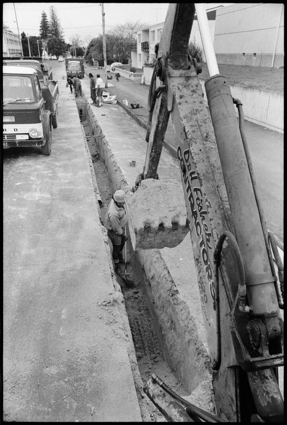 Date8 October 1975Reference Numberphoto gcc-35757DescriptionFilling is poured into a trench in Willow street where Council staff have been replacing the 65 year old spiral riveted steel pipe with a larger capacity water main. Published 8 October 1975FormatNegativePhysical Description35mm black-and-white negative (1/17)Photographer/CreatorBay of Plenty Times