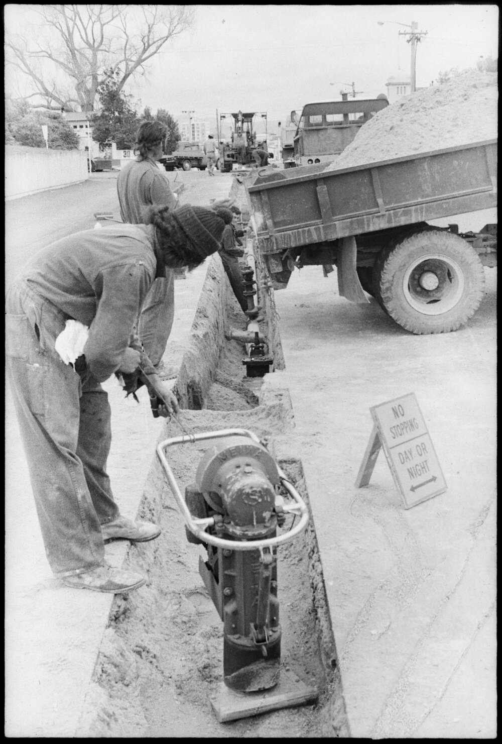 Date8 October 1975Reference Numberphoto gcc-35759DescriptionFilling is poured into a trench in Willow street where Council staff have been replacing the 65 year old spiral riveted steel pipe with a larger capacity water main. Published 8 October 1975FormatNegativePhysical Description35mm black-and-white negative (3/17)Photographer/CreatorBay of Plenty Times