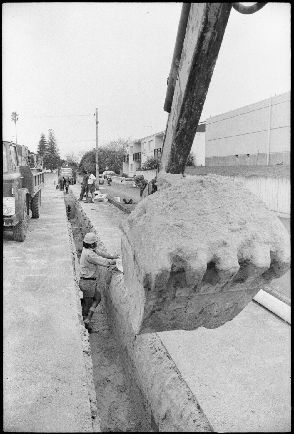 Date8 October 1975Reference Numberphoto gcc-35768DescriptionFilling is poured into a trench in Willow street where Council staff have been replacing the 65 year old spiral riveted steel pipe with a larger capacity water main. Published 8 October 1975FormatNegativePhysical Description35mm black-and-white negative (12/17)Photographer/CreatorBay of Plenty Times