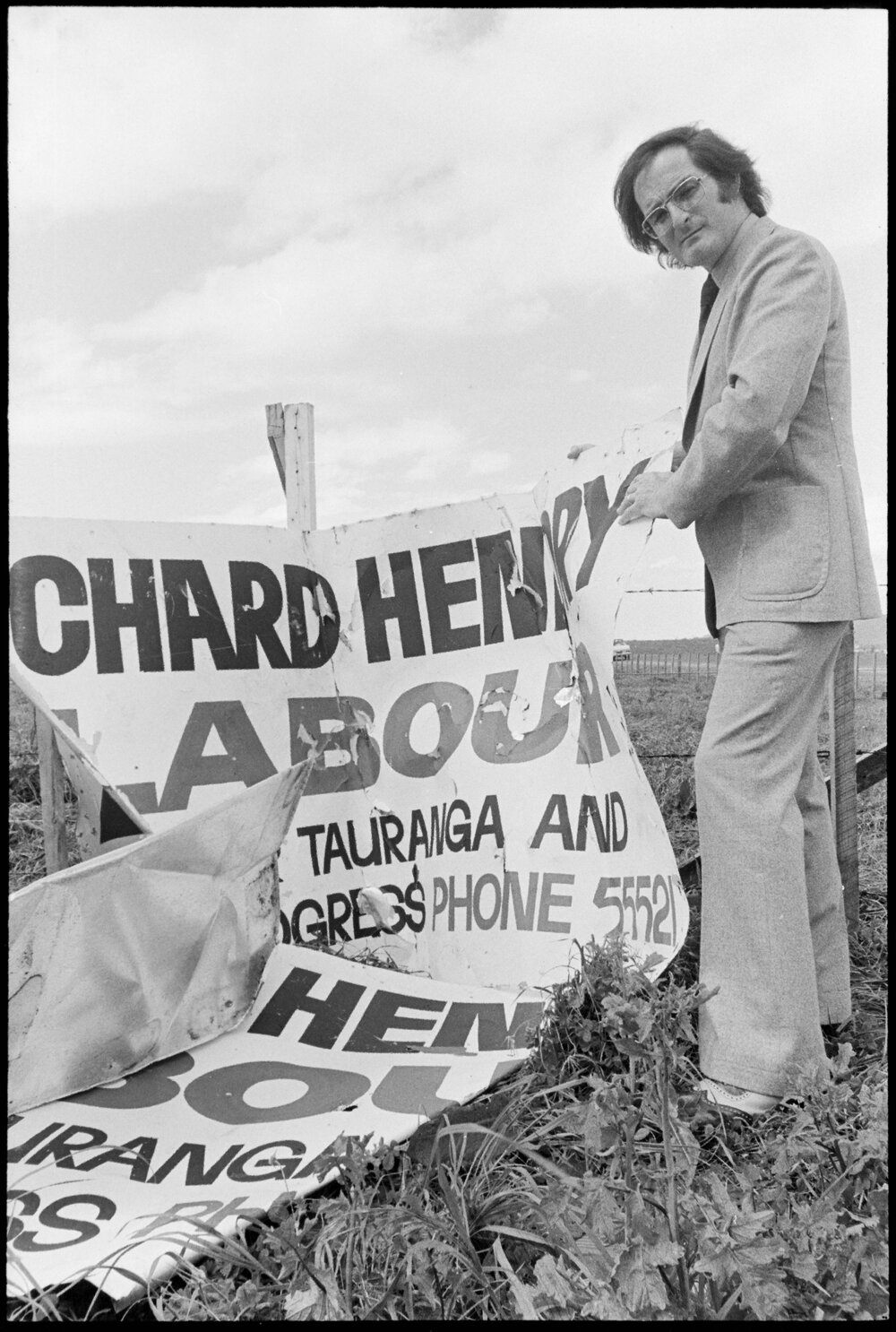 Date15 October 1975Reference Numberphoto gcc-35954DescriptionWith a wrecked metal election hoarding, Mr Richard Hendry, Labour candidate for Tauranga. Published 15 October 1975.FormatNegativePhysical Description35mm black-and-white negative (1/4)Photographer/CreatorBay of Plenty Times