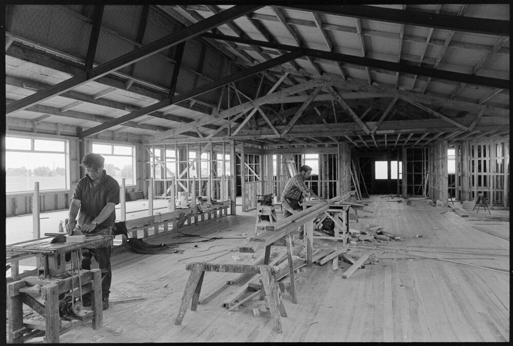 Date16 October 1975Reference Numberphoto gcc-35965DescriptionTe Puna builders, Mr W. Borell (foreground) and his brother, Mr C. G. Borell, continue work on the construction of the Te Puna Rugby Club's new clubhouse. Te Puna Rugby Club. Published 16 October 1975.FormatNegativePhysical Description35mm black-and-white negative (1/6)Photographer/CreatorBay of Plenty Times