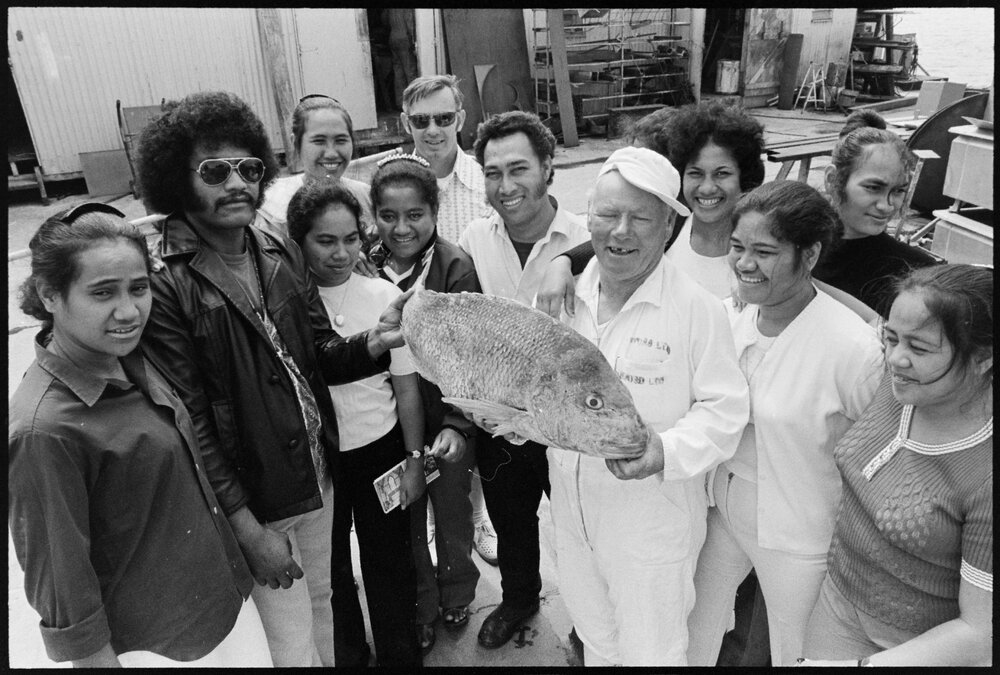 Date18 October 1975Reference Numberphoto gcc-36012DescriptionMr George Reid, of Sanfords Fisheries Ltd, shows off a 22lb snapper to a group of Cook Islands Teachers' College students who toured the establishment. Published 18 October 1975.FormatNegativePhysical Description35mm black-and-white negative (2/6)Photographer/CreatorBay of Plenty Times
