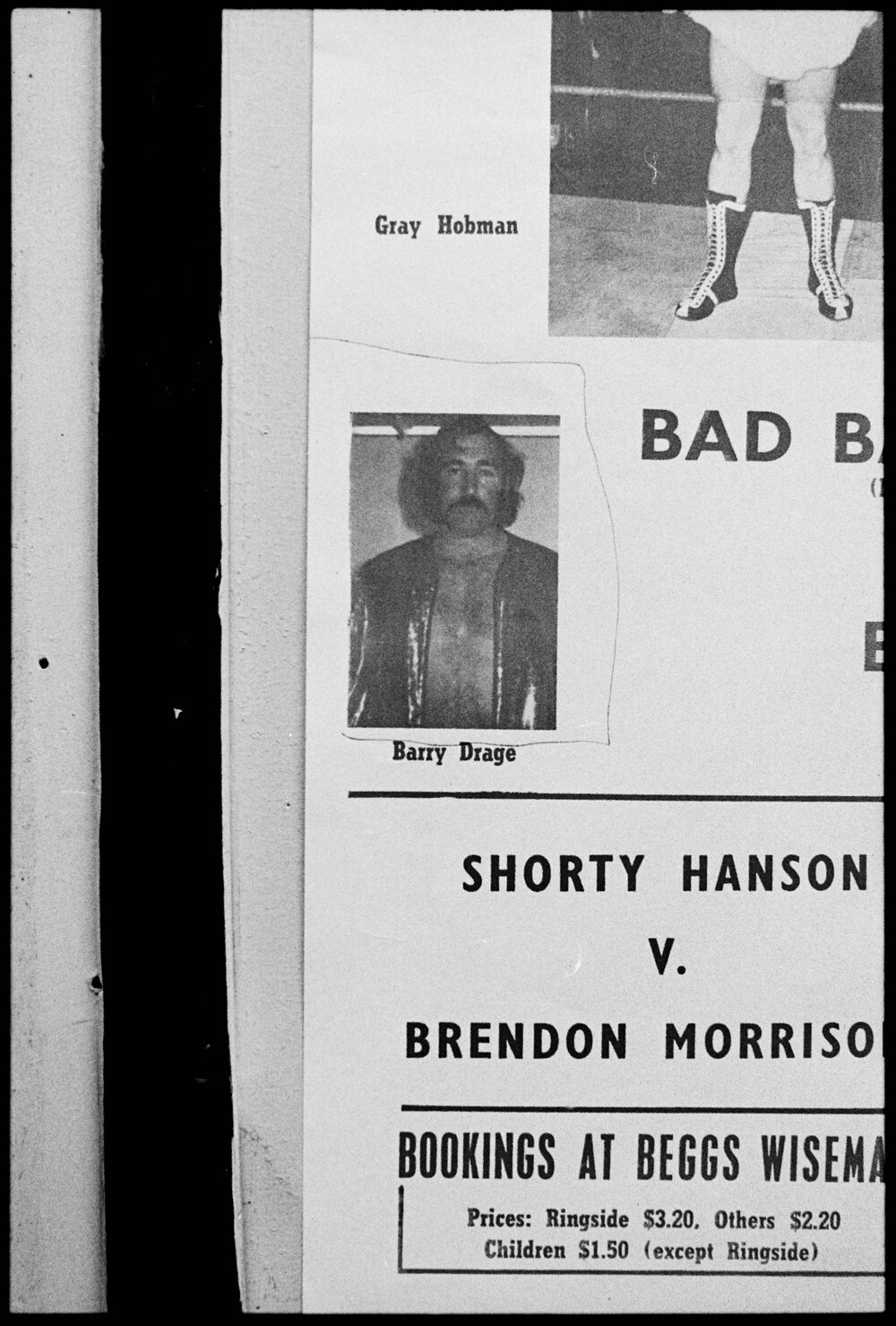 Date18 October 1975Reference Numberphoto gcc-36026DescriptionPartial view of possibly a flyer of wrestling match between Shorty Hanson and Brendon Morrison, includes photos (some not visible) of Ron Astrella, Gray Hobman and Barry Drage. Published 18 October 1975.FormatNegativePhysical Description35mm black-and-white negative (5/6)Photographer/CreatorBay of Plenty Times