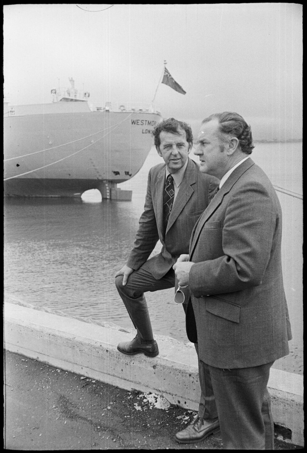 Date18 October 1975Reference Numberphoto gcc-36043DescriptionDiscussing the Port of Tauranga's container prospects are National Party MPs Mr Venn Young, Egmont (left) and Mr Allen, Tauranga. The Westmoreland vessel is in view behind them. Published 18 October 1975.FormatNegativePhysical Description35mm black-and-white negative (7/8)Photographer/CreatorBay of Plenty Times