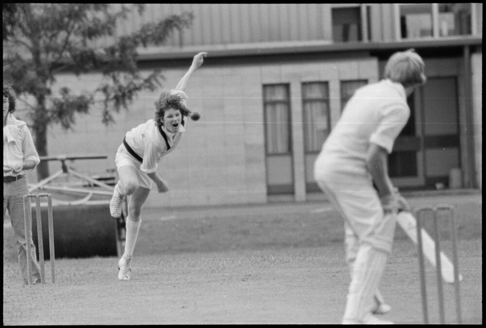 Date20 October 1975Reference Numberphoto gcc-36057DescriptionBrendan Bracewell, the College bowler, fires a ball towards Graham Hunter, of Greerton. The umpire is Lindsay Singleton, of the Greerton team.Published 20 October 1975FormatNegativePhysical Description35mm black-and-white negative (4/6)Photographer/CreatorBay of Plenty Times