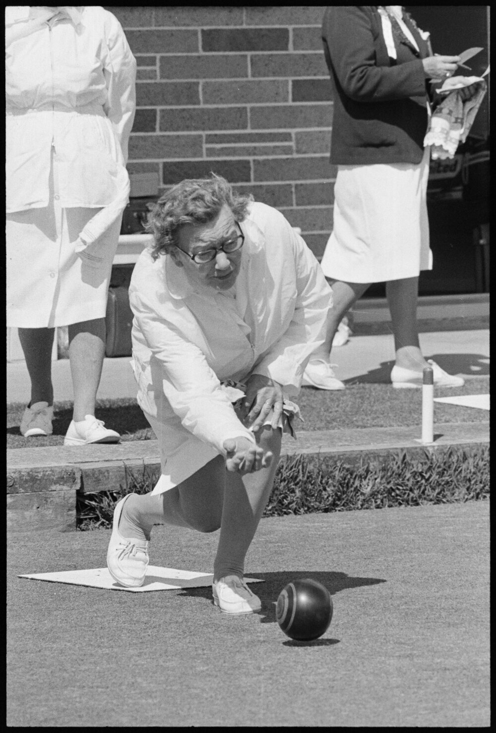 Date21 October 1975Reference Numberphoto gcc-36081DescriptionMrs Olive Hughes (Tauranga South) competing in the Bay of Plenty Centre fours lawn bowls tournament. Published 21 October 1975.FormatNegativePhysical Description35mm black-and-white negative (7/7)Photographer/CreatorBay of Plenty Times