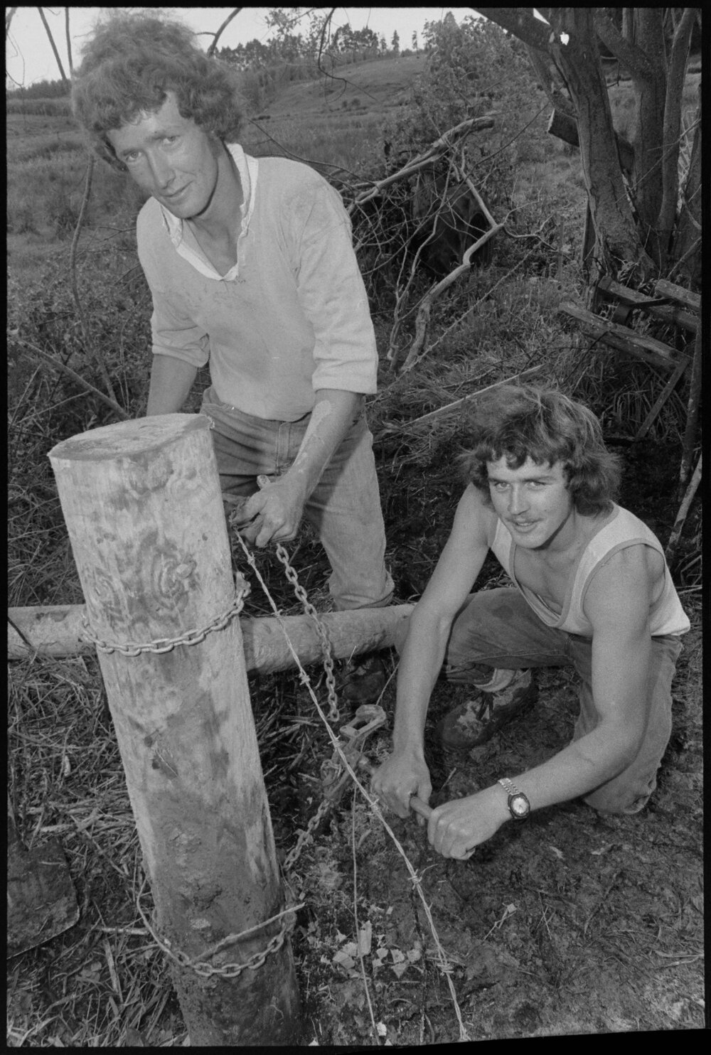 Date22 October 1975Reference Numberphoto gcc-36130DescriptionYoung Farmers: Mike Ottaway (left), of Ōmokoroa, and Callum Coubrough, of Kaimai, helping erect a ring fence around the Disabled Riding Association property. Published 22 October 1975.FormatNegativePhysical Description35mm black-and-white negative (1/6)Photographer/CreatorBay of Plenty Times