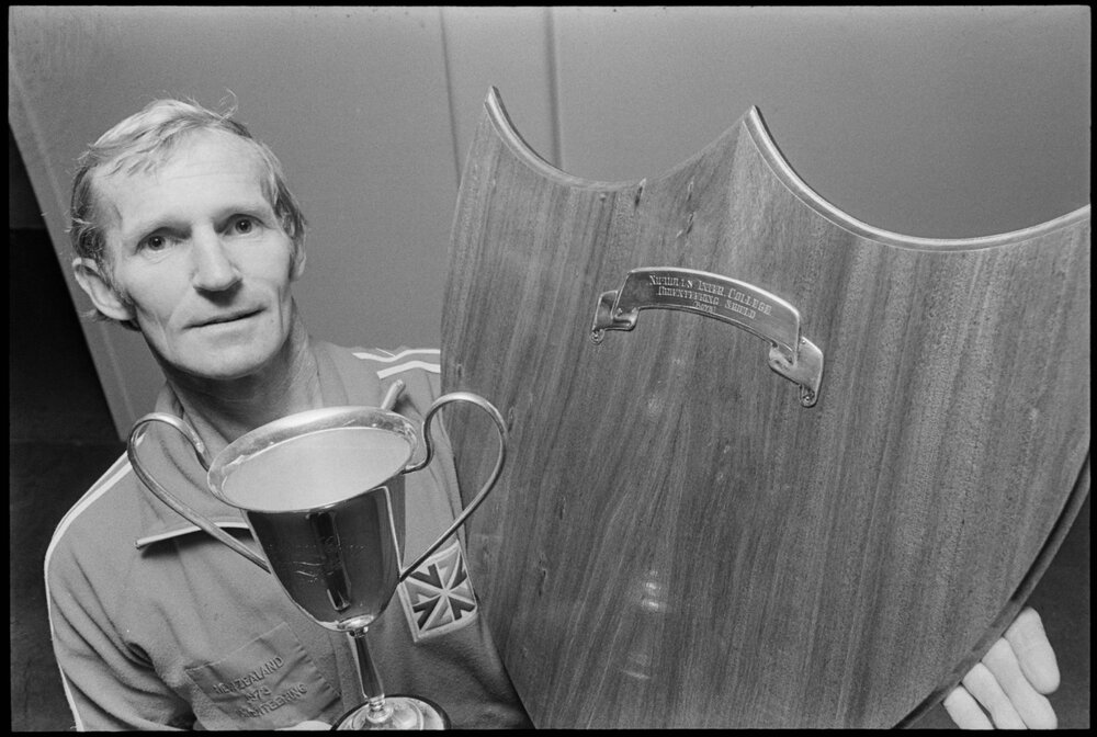 Date23 October 1975Reference Numberphoto gcc-36148DescriptionThe first inter-college orienteering championships to have been held in New Zealand will be run at the Ōropi bush site. The founder president of the Colleges Day events in the Bay of Plenty Association, Tony Nicholls, with the shield and cup to go to the winning Bay of Plenty boys and girls teams. Published 23 October 1975.FormatNegativePhysical Description35mm black-and-white negative (1/3)Photographer/CreatorBay of Plenty Times