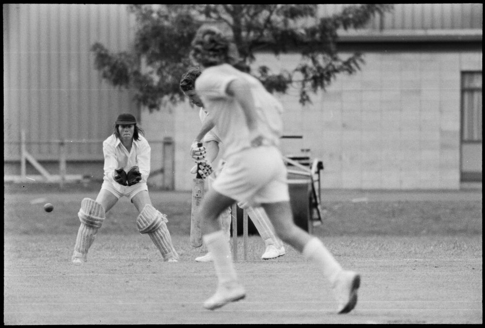 Date24 October 1975Reference Numberphoto gcc-36186DescriptionCricket. Greerton captain Mike Sandlant defends against the bowling of College's bowler Briar Palmer (at right). The wicket keeper is Neil Marwick. Published 24 October 1975.FormatNegativePhysical Description35mm black-and-white negative (1/3)Photographer/CreatorBay of Plenty Times