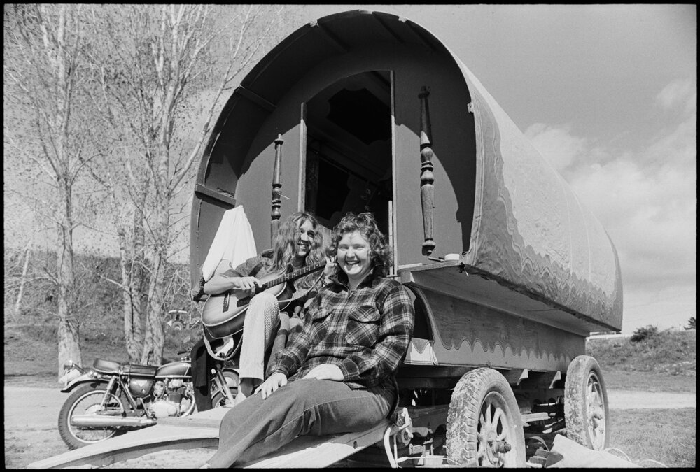 Date24 October 1975Reference Numberphoto gcc-36194DescriptionSitting on the steps of the home-built caravan is traveller Sue Pickard (foreground), a Canadian, and Glenn Morton, an Englishman. Published 24 October 1975FormatNegativePhysical Description35mm black-and-white negative (6/9)Photographer/CreatorBay of Plenty Times