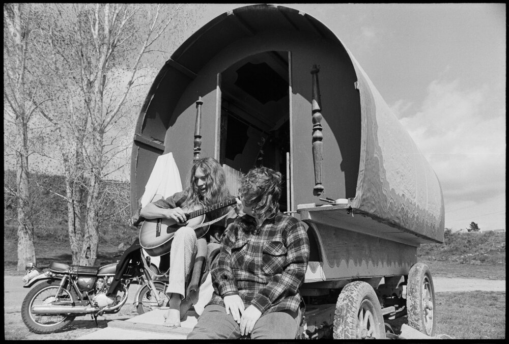 Date24 October 1975Reference Numberphoto gcc-36196DescriptionSitting on the steps of the home-built caravan is traveller Sue Pickard (foreground), a Canadian, and Glenn Morton, an Englishman. Published 24 October 1975FormatNegativePhysical Description35mm black-and-white negative (8/9)Photographer/CreatorBay of Plenty Times