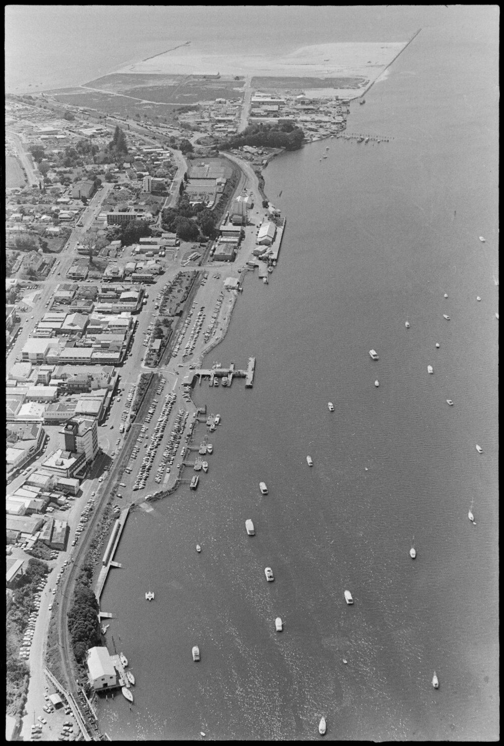 Date25 October 1975Reference Numberphoto gcc-36200DescriptionThe southern parking reclamation, off the Strand and the more recent northern reclamation, are dominant features of this aerial photograph taken from a Tauranga Aero Club aircraft. The major reclamation at Sulphur Point is another notable addition and several large new buildings are also evident. Published 25 October 1975.FormatNegativePhysical Description35mm black-and-white negative (3/3)Photographer/CreatorBay of Plenty Times