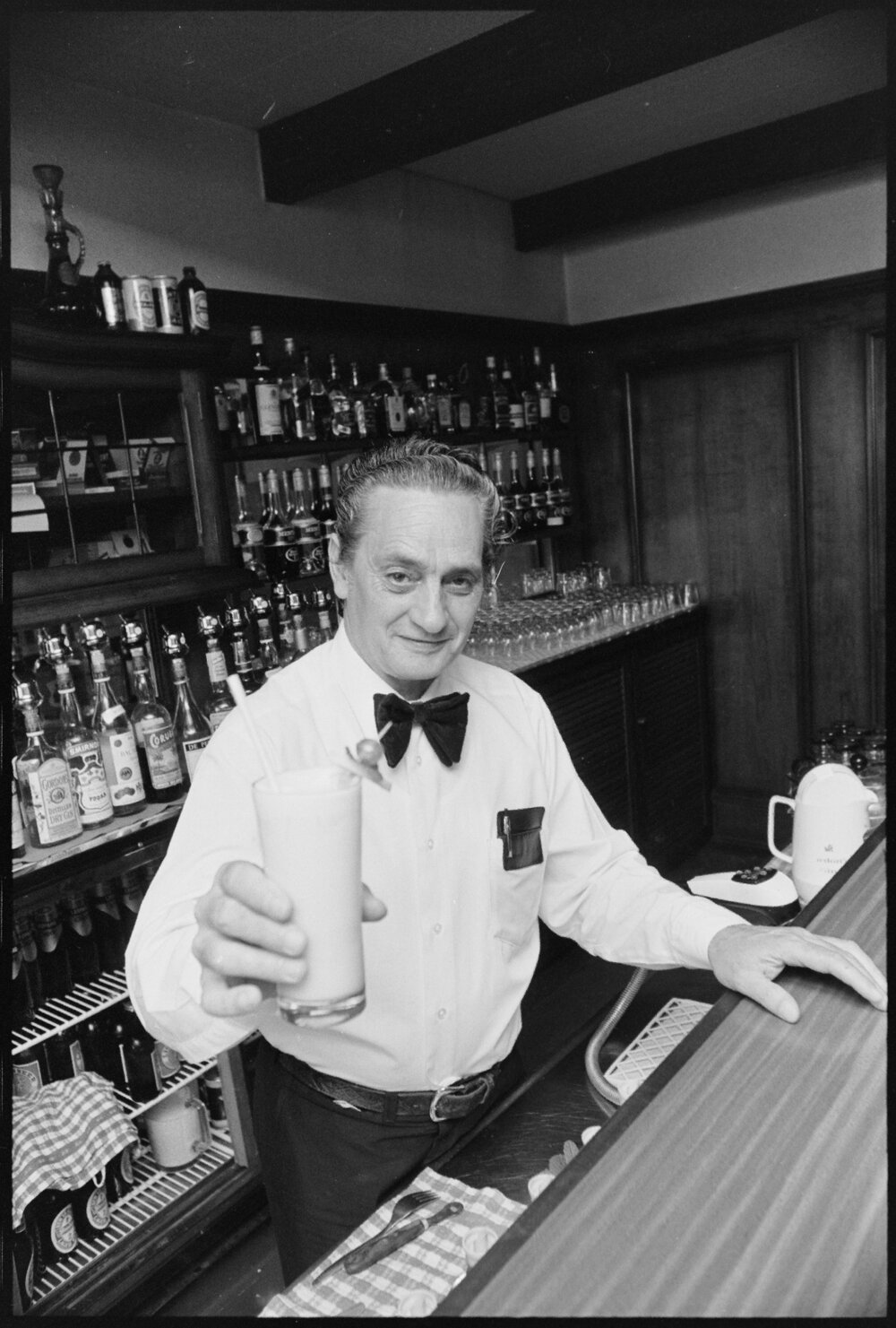 Date25 October 1975Reference Numberphoto gcc-36206DescriptionMr Allen Salt, the barman at Willow Park Hotel, presents his "Fantasy" cocktail, which won him first place in an international cocktail competition four years prior. Published 25 October 1975.FormatNegativePhysical Description35mm black-and-white negative (6/9)Photographer/CreatorBay of Plenty Times