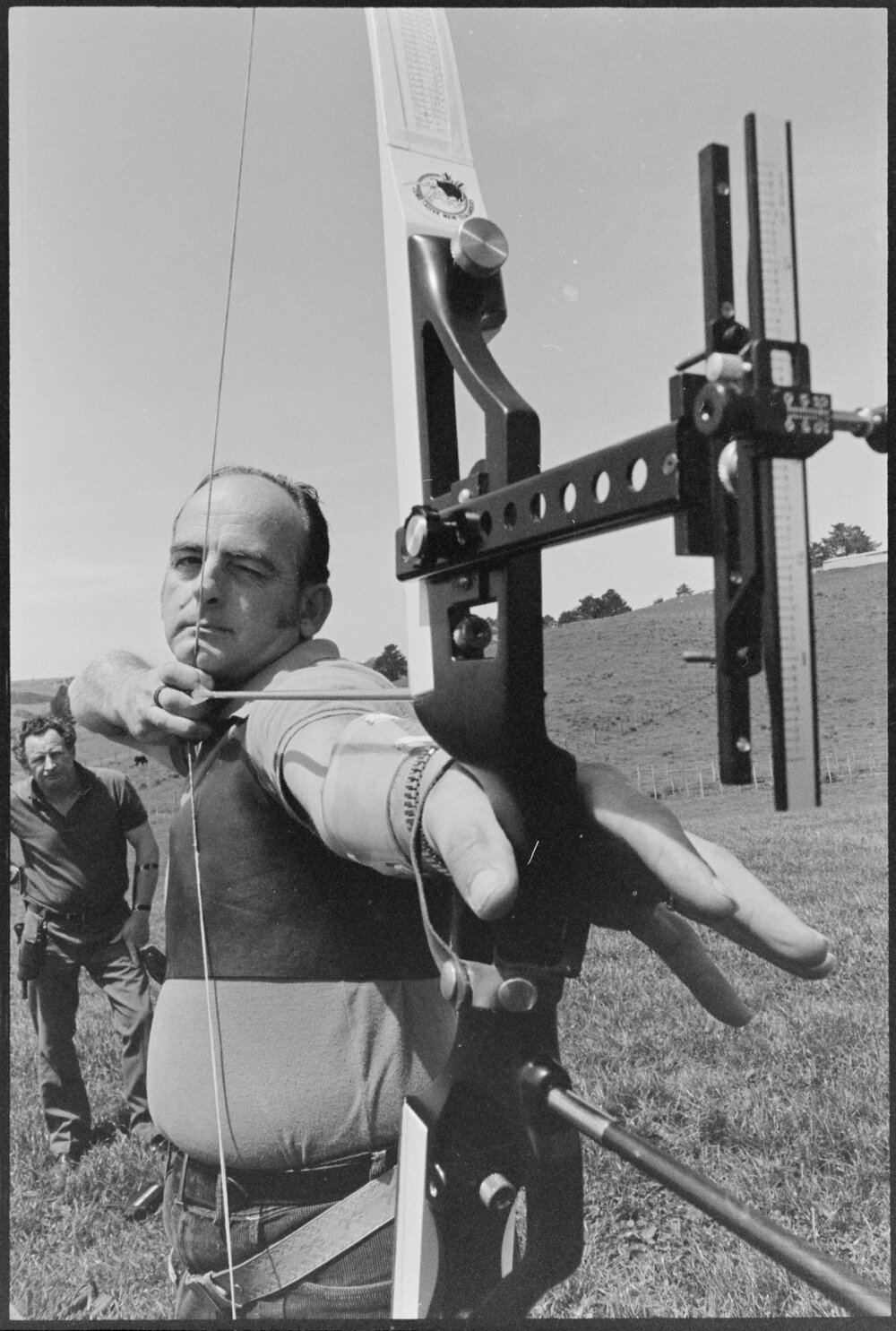 Date27 October 1975Reference Numberphoto gcc-36243DescriptionArchery at Fentons Farm, Ōropi. Published 27 October 1975.FormatNegativePhysical Description35mm black-and-white negative (1/9)Photographer/CreatorBay of Plenty Times