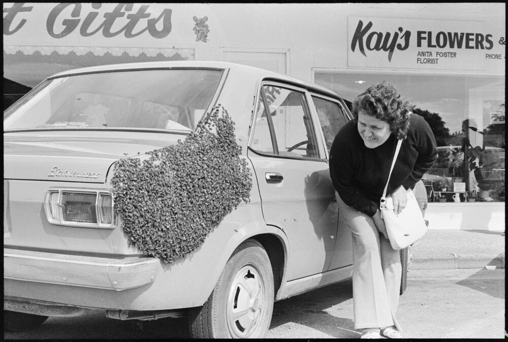 Date29 October 1975Reference Numberphoto gcc-36313DescriptionMrs R. Poole, pictured next to bees settled on the back of her car at the Greerton shops. Published 29 October 1975.FormatNegativePhysical Description35mm black-and-white negative (2/9)Photographer/CreatorBay of Plenty Times