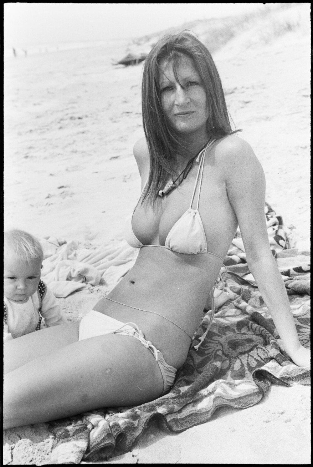 Date31 October 1975Reference Numberphoto gcc-36351DescriptionMount Maunganui resident Martina Burggraaf from France and her baby daughter Saline sample the sun at Mount Maunganui. Published 31 October 1975.FormatNegativePhysical Description35mm black-and-white negative (2/3)Photographer/CreatorBay of Plenty Times