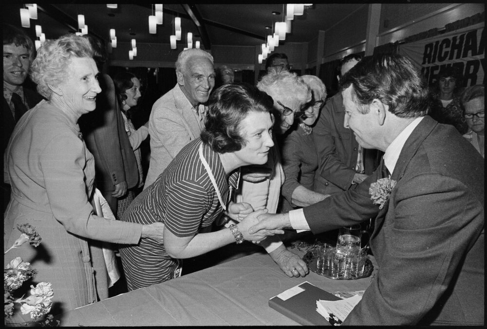 Date3 November 1975Reference Numberphoto gcc-36423DescriptionLabour Party supporters crowd around the Prime Minister, Mr. Rowling, to shake his hand after he addressed a political rally at Ernilea Lounge in Tauranga. Published 3 November 1975FormatNegativePhysical Description35mm black-and-white negative (7/12)Photographer/CreatorBay of Plenty Times