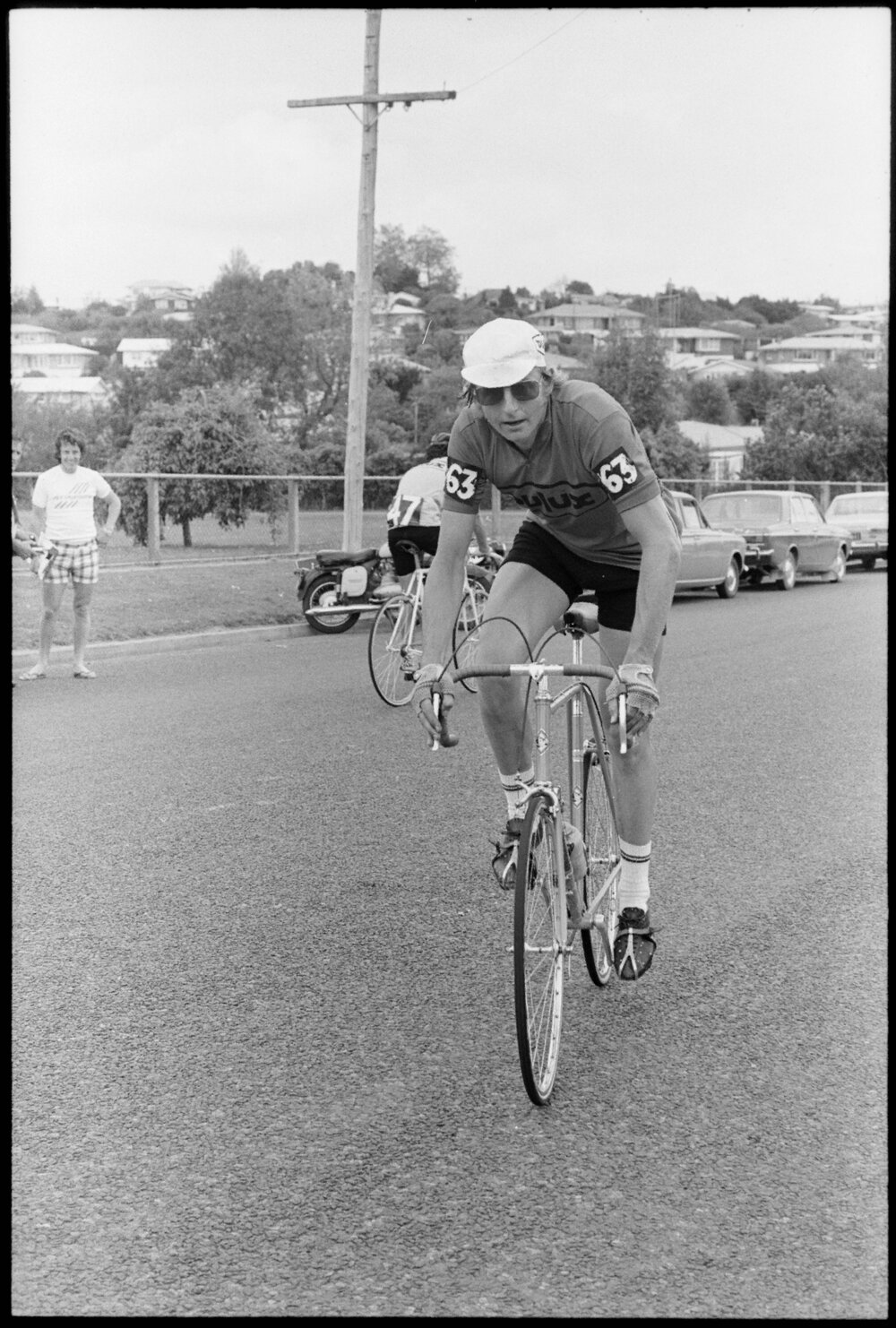 Date4 November 1975Reference Numberphoto gcc-36450DescriptionBarry Ulyate, winner of the Paeroa-Tauranga second stage cycle race. Tour leader is Jamie Richards, no 82. Published 4 November 1975. FormatNegativePhysical Description35mm black-and-white negative (1/6)Photographer/CreatorBay of Plenty Times