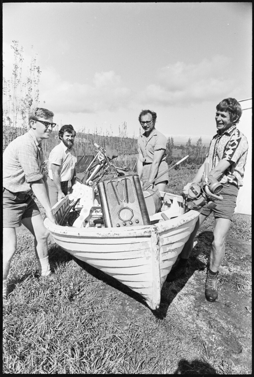 Date6 November 1975Reference Numberphoto gcc-36551DescriptionFrom left, Messrs John Stevens, Robert Anderson, Adrian Blom and Russell Bell with a boatload of items for selling at the Ōmokoroa-Te Puna Lions Club sale.Published 6 November 1975.FormatNegativePhysical Description35mm black-and-white negative (7/9)Photographer/CreatorBay of Plenty Times