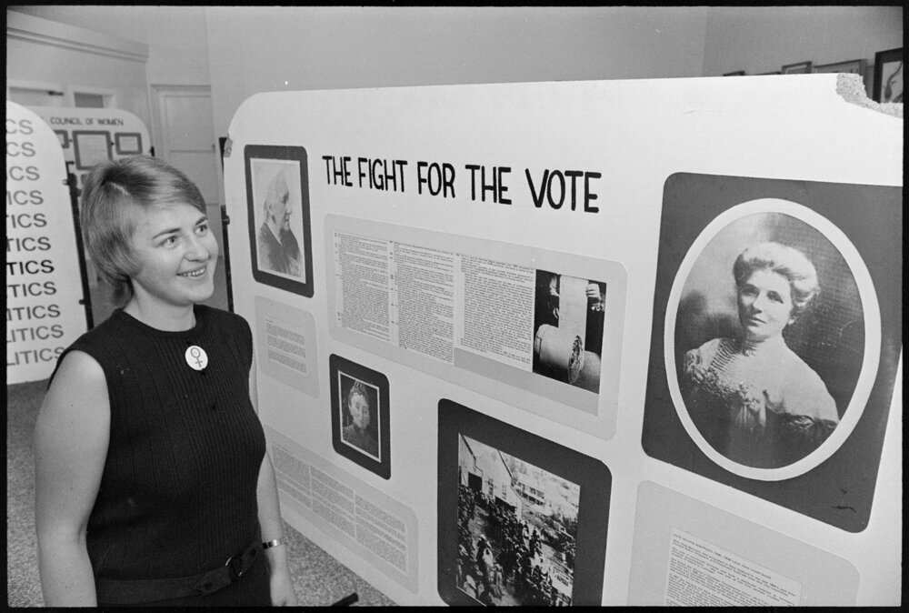 Date7 November 1975Reference Numberphoto gcc-36583DescriptionInternational Women's Year committee member Kay Junge admires an exhibit in 'The History of New Zealand Women in Politics' display at the Building and Display Centre. Published 7 November 1975.FormatNegativePhysical Description35mm black-and-white negative (1/3)Photographer/CreatorBay of Plenty Times