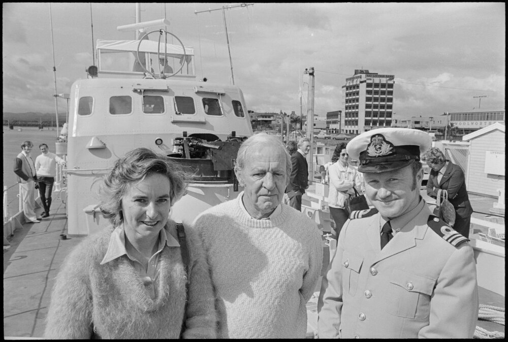 Date8 November 1975Reference Numberphoto gcc-36626DescriptionTaupō borough councillors, Mrs M. L. Ernest and Mr. G. Marlow on board the HMNZS Taupō with the captain, Lieutenant Commander Herlihy. Published 8 November 1975.FormatNegativePhysical Description35mm black-and-white negative (1/3)Photographer/CreatorBay of Plenty Times