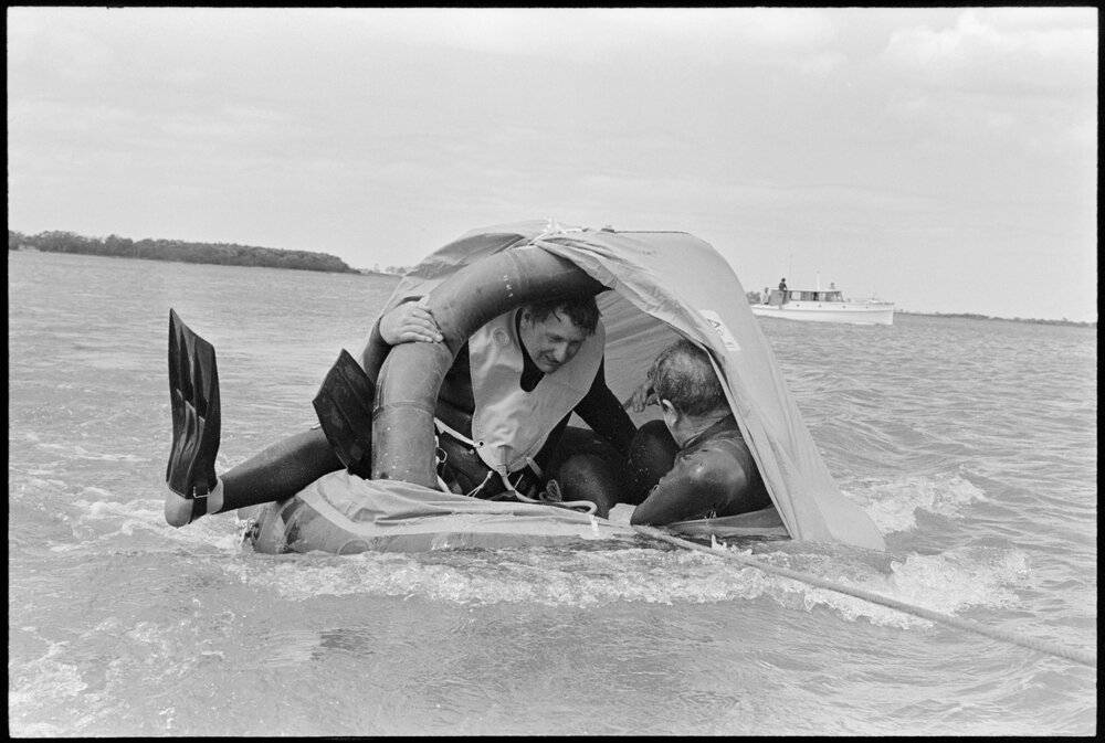 Date10 November 1975Reference Numberphoto gcc-36663DescriptionSkindiving brothers Jerry and John Sims relax in the liferaft after retrieving it from the air drop. The drop was part of a demonstration which included fire-fighting and the use of flares.Published 10 November 1975FormatNegativePhysical Description35mm black-and-white negative (1/3)Photographer/CreatorBay of Plenty Times