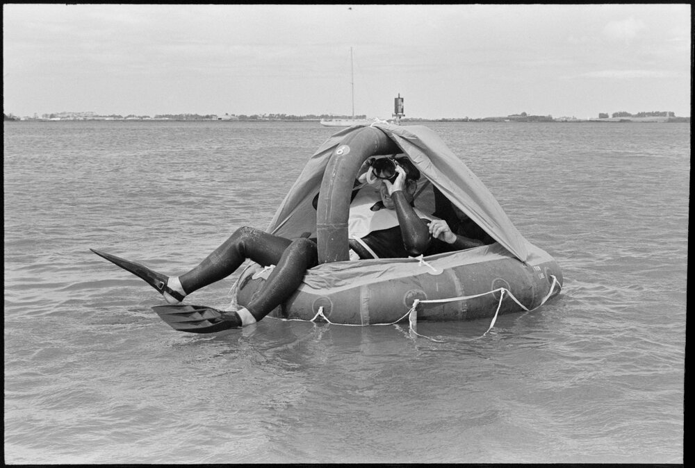 Date10 November 1975Reference Numberphoto gcc-36666DescriptionSkindiving brothers Jerry and John Sims relax in the liferaft after retrieving it from the air drop. The drop was part of a demonstration which included fire-fighting and the use of flares. Published 10 November 1975FormatNegativePhysical Description35mm black-and-white negative (1/3)Photographer/CreatorBay of Plenty Times