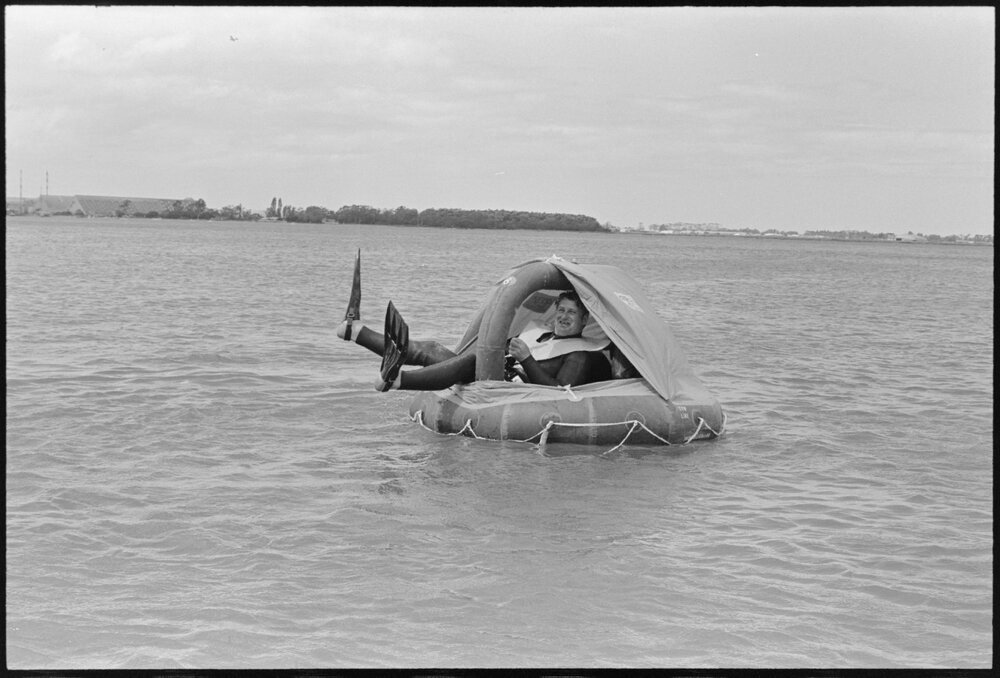 Date10 November 1975Reference Numberphoto gcc-36667DescriptionSkindiving brothers Jerry and John Sims relax in the liferaft after retrieving it from the air drop. The drop was part of a demonstration which included fire-fighting and the use of flares. Published 10 November 1975FormatNegativePhysical Description35mm black-and-white negative (2/3)Photographer/CreatorBay of Plenty Times