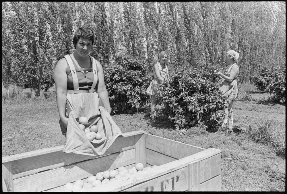 Date11 November 1975Reference Numberphoto gcc-36669Description1975 Fruitgrowers field day. Emptying tangelos into a crate ready for sorting and packing is Mrs Marie Hill of Ōmokoroa. The fruit pickers will be a part of the field day display as they carry out their work. Published 11 November 1975.FormatNegativePhysical Description35mm black-and-white negative (1/6)Photographer/CreatorBay of Plenty Times